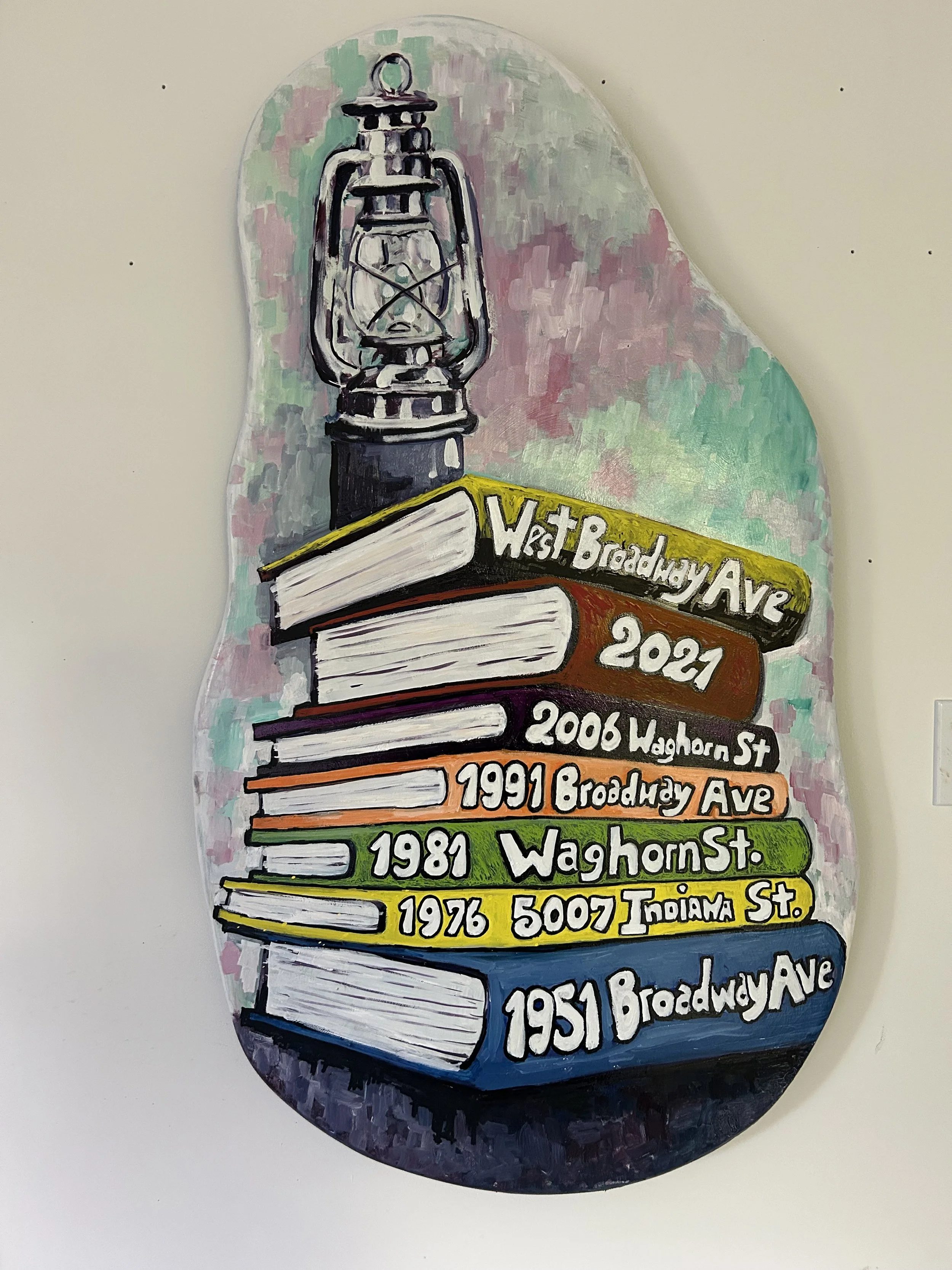 – A stack of books features the spines marked with the various addresses the library has held over the years—acknowledging its adaptability and enduring role.